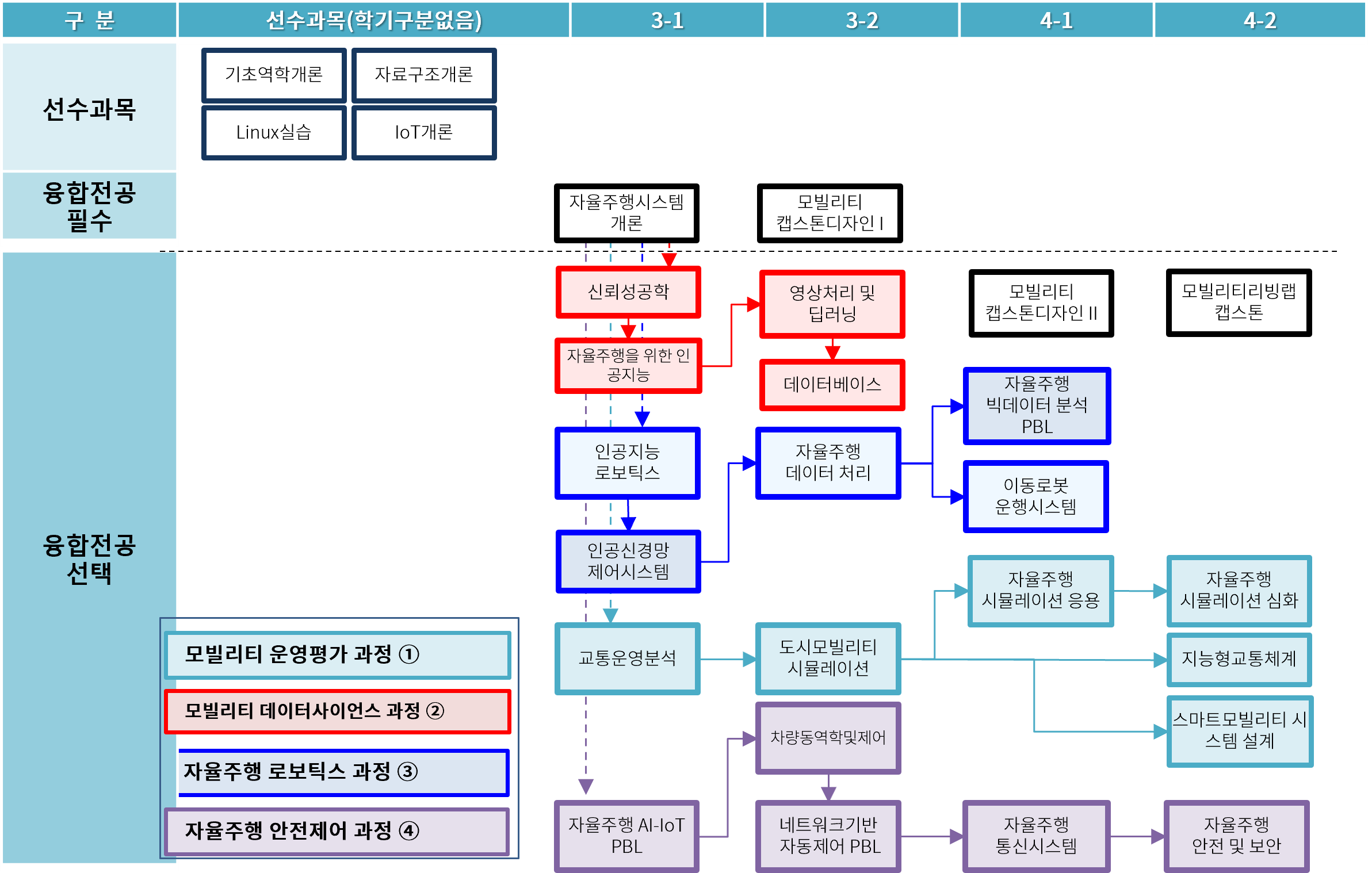 - 자율주행시스템 개론, 자율주행 AI-IoT PBL, 네트워크 기반 자동제어 PBL, 자율주행 통신시스템, 자율주행 안전 및 보안, 차량동역학및제어